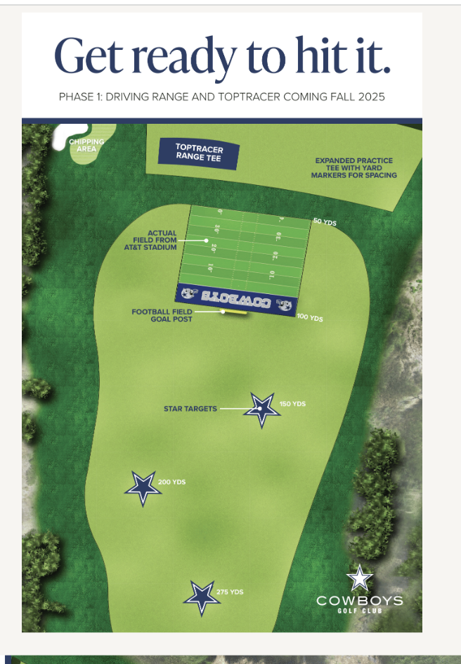 We’re not just adding an 18-hole artificial turf putting course – our driving range is getting a complete makeover too. The new driving range will feature a 50-yard, game-used turf football field that we purchased directly from the Dallas Cowboys. We’re bringing in goalposts and adding the newest Toptracer technology to give our practice facilities that unique Cowboys feel you won’t find anywhere else.